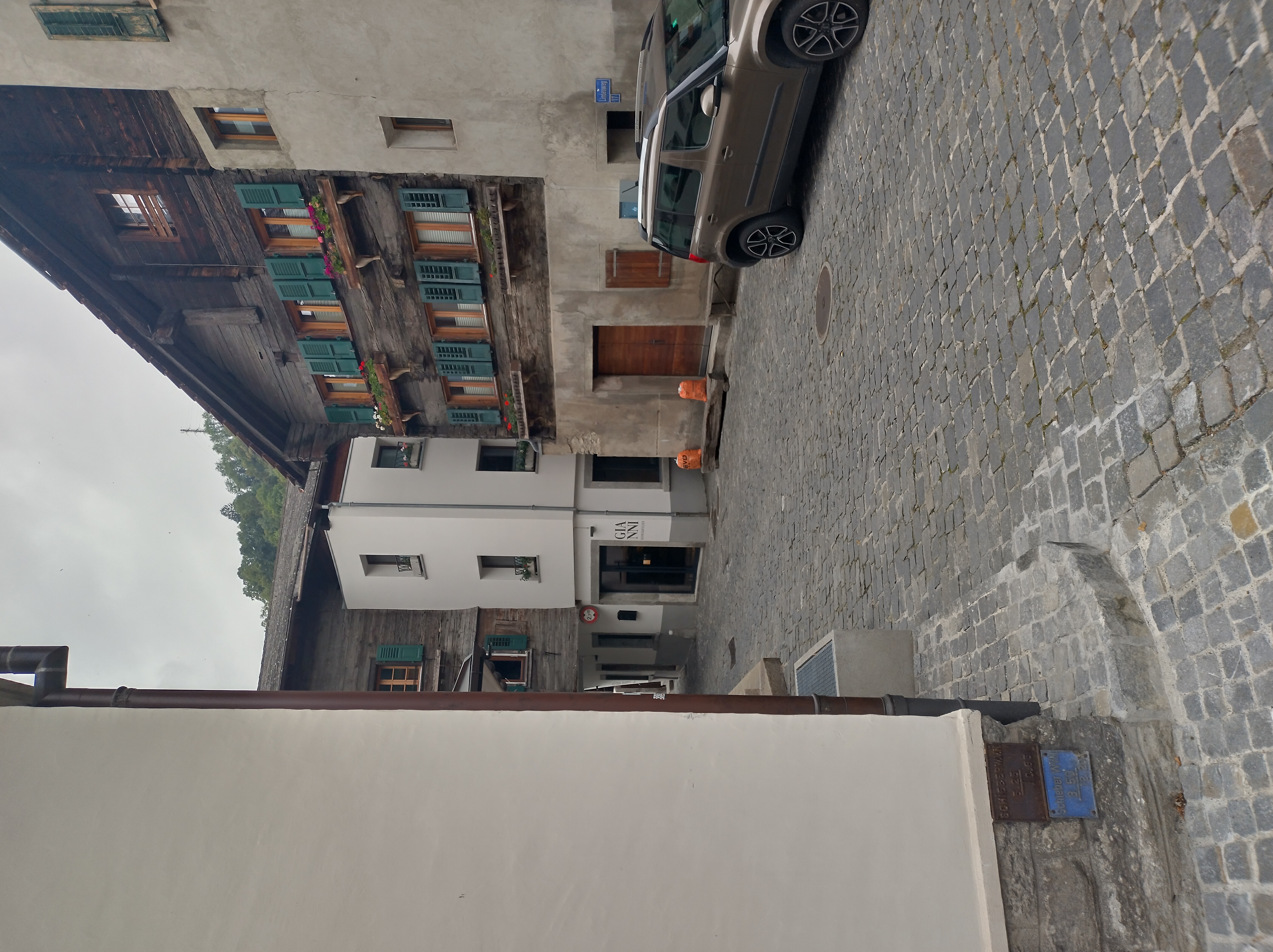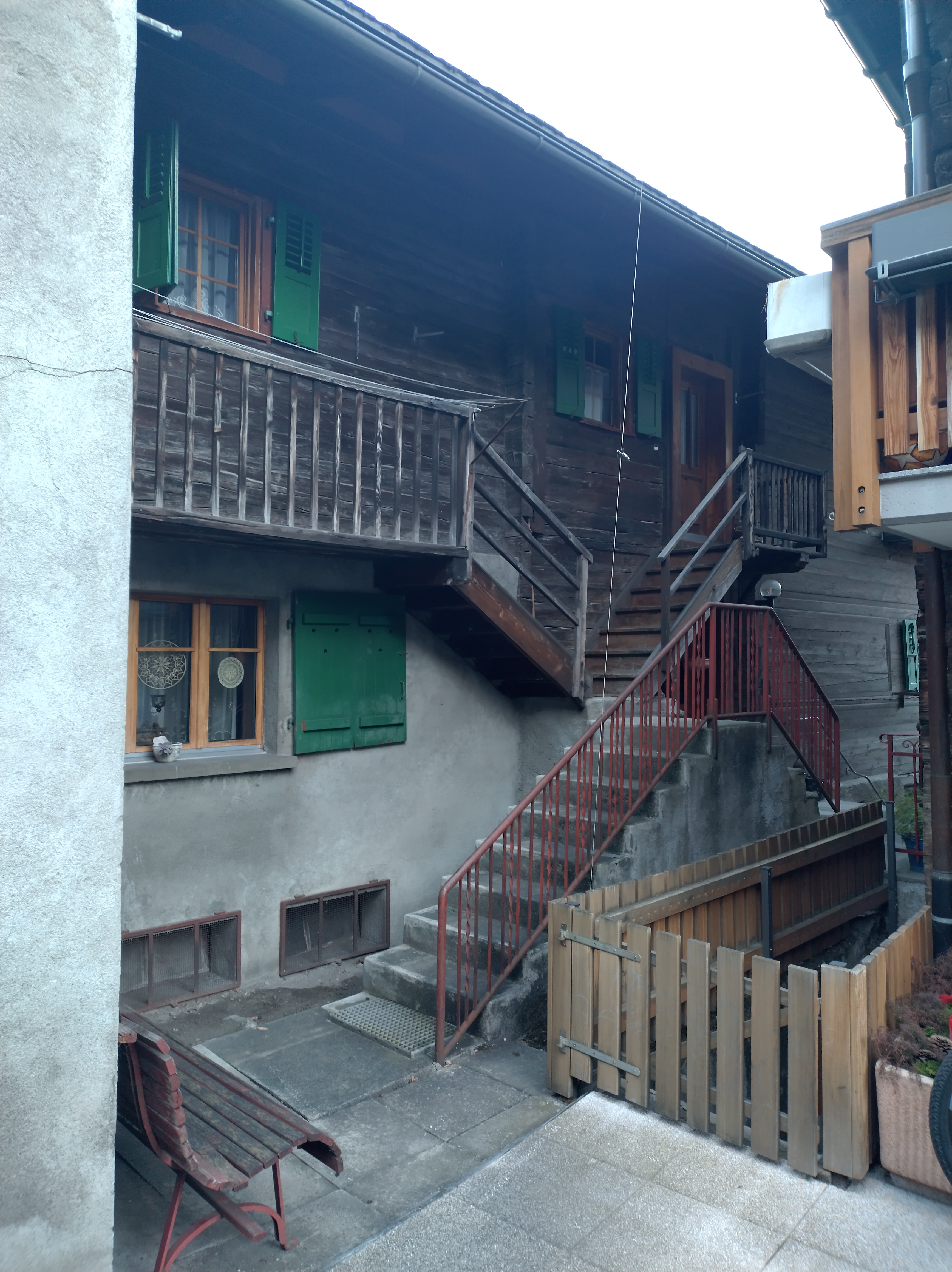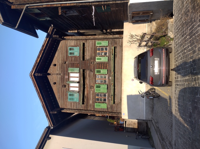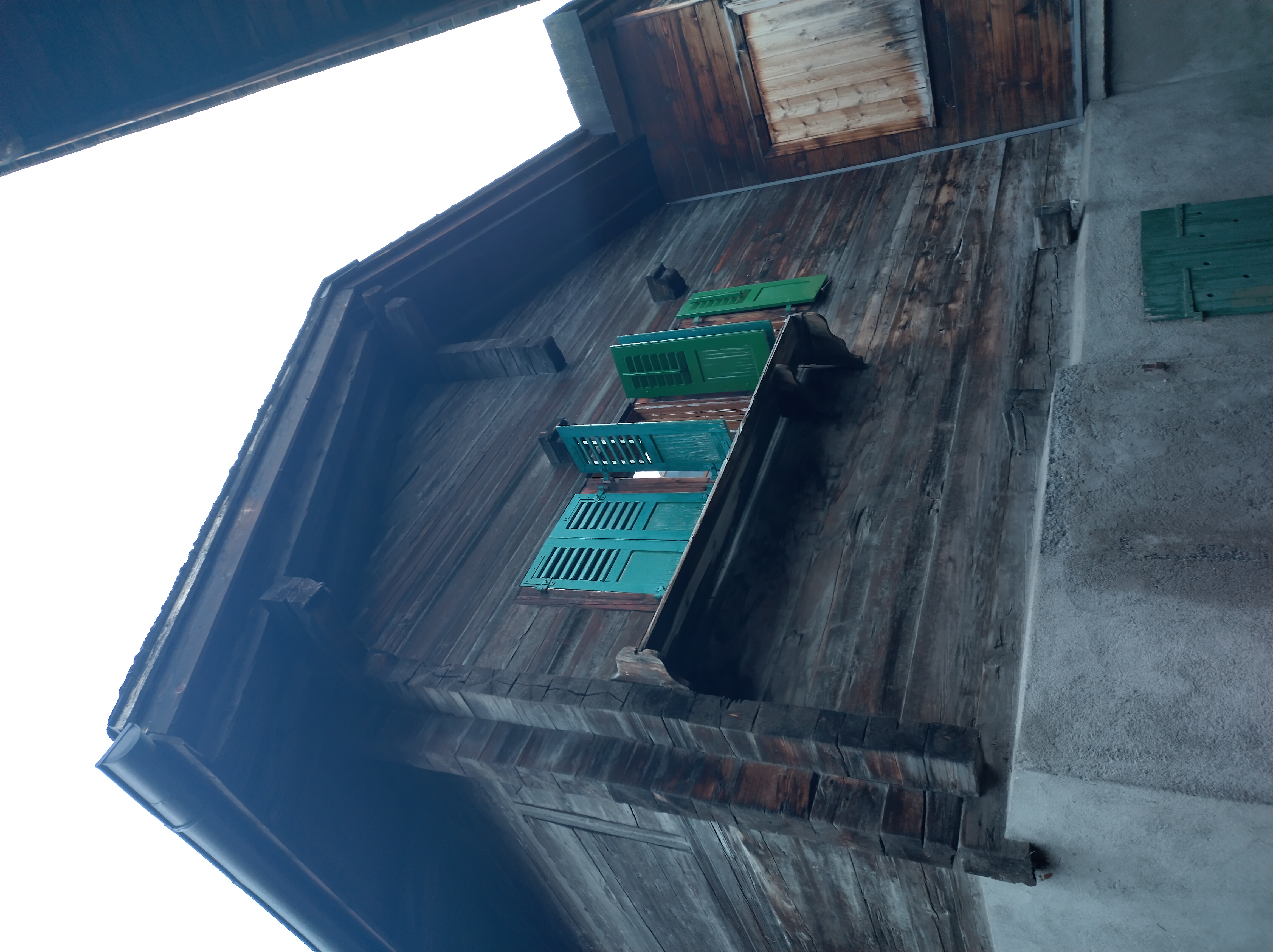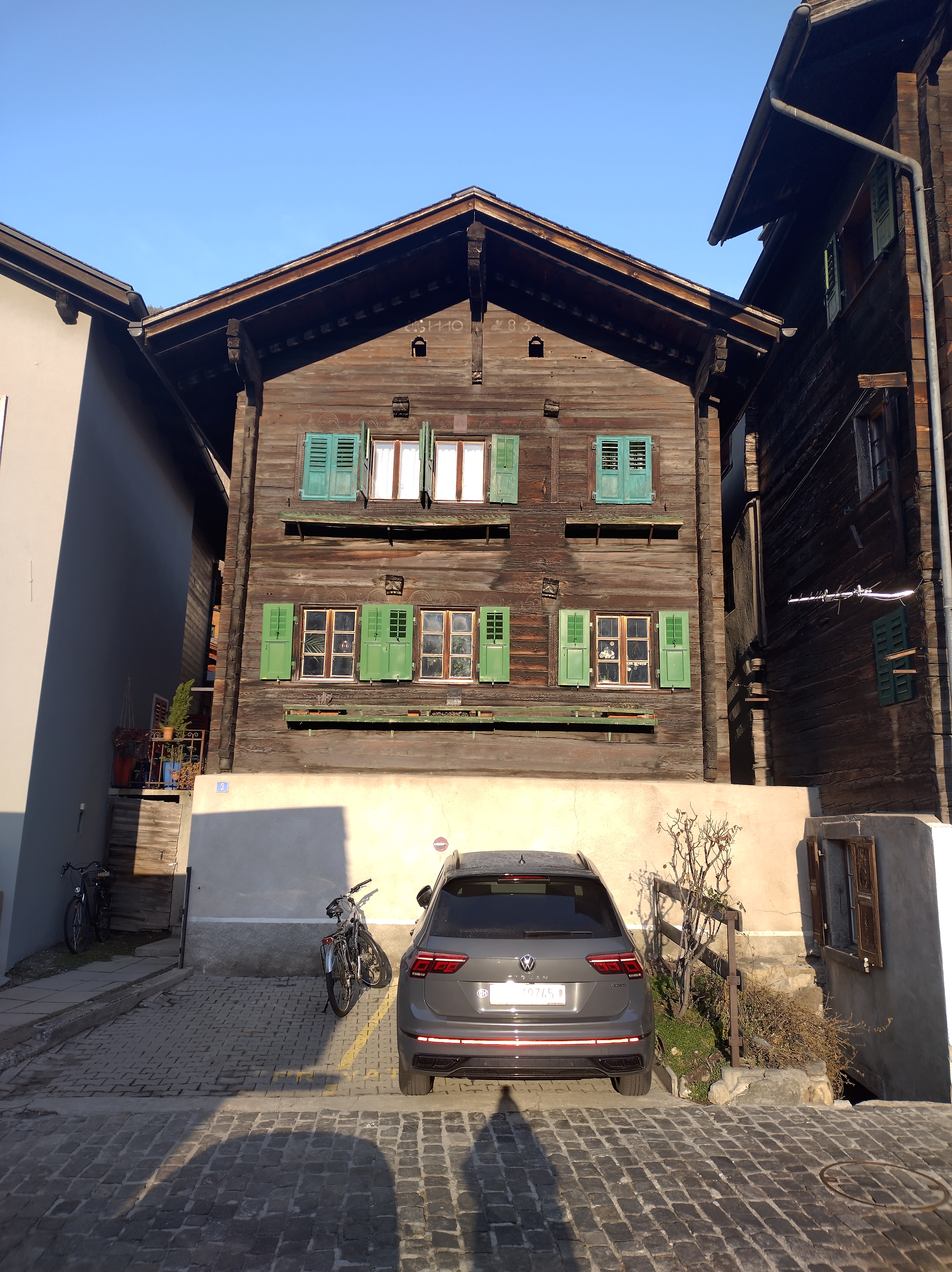 Neuere, renovierte Gebäude sind weiss gestrichen, manchmal ganz leicht gelblich. Einsätze sind grau verputzt oder gestrichen, oder aus dunklem alten Holz.